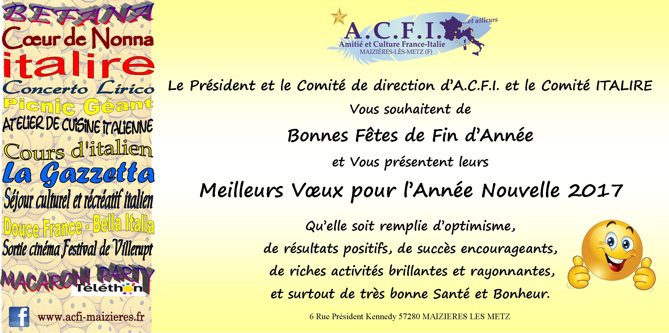 Bonnes fêtes de fin d’année et Meilleurs vœux pour 2017 Publié le 24 décembre 201620 mars 2017Auteur/autrice ACFI Joyeux Noël ! Buon Natale ! Meilleurs Vœux pour l’année 2017 ! Auguri per l’anno nuovo 2017 !