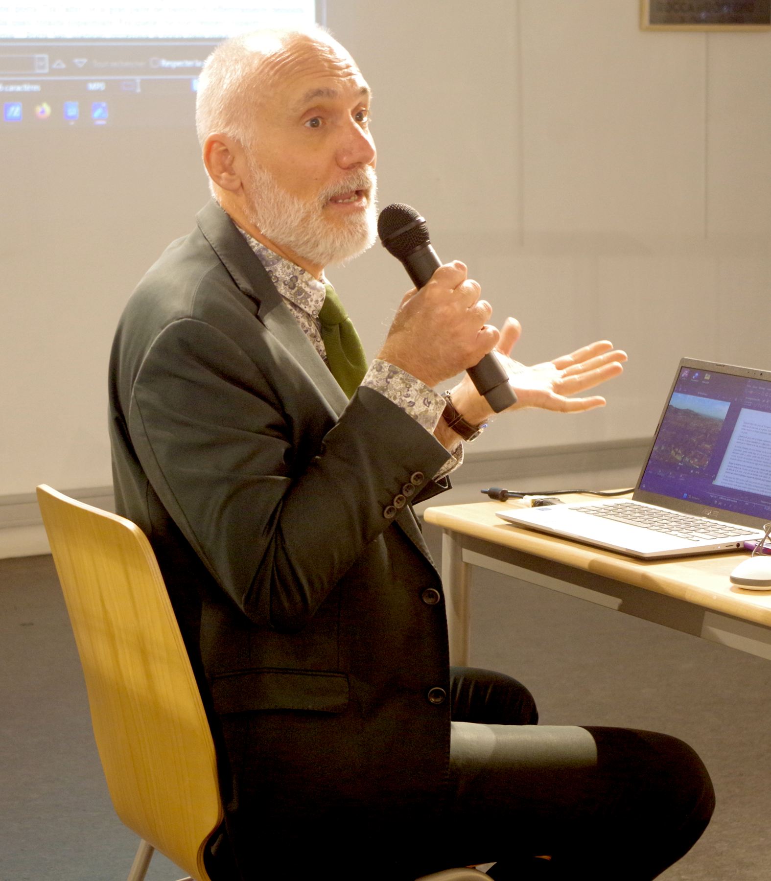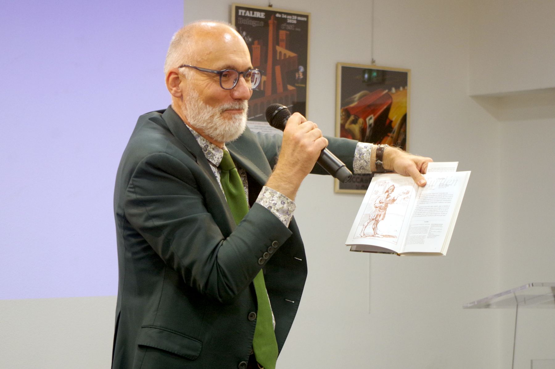 Il revenait ensuite à Emilio Lolli de nous présenter sa ville pour laquelle, de l’avis général, il a été ce 24 mars, un excellent ambassadeur. Il a rappelé à grandes lignes l’histoire si riche de Bologne depuis l’Antiquité romaine, nous enseignant au passage des expressions bolognaises comme habiter fuori mura, qui signifie qu’on habite au-delà des anciennnes murailles enserrant le centre ville et aujourd’hui disparues. Bien sûr il a évoqué les 35 km d’arcades qui font la particularité de la ville et permettent aux piétons d’être toujours à l’abri. Bologne est devenue aujourd’hui une ville touristique alors que longtemps elle était avant tout une ville universitaire très prisée, connue également pour sa foire. Il nous a montré quelques curiosités, ignorées généralement des guides touristiques, comme le Jardin tout minéral du Guasto, la tradition du théâtre de marionnettes, sans oublier les spécialités gastronomiques. Tout son exposé était émaillé d’anecdotes personnelles montrant le grand amour qu’il porte à sa ville.