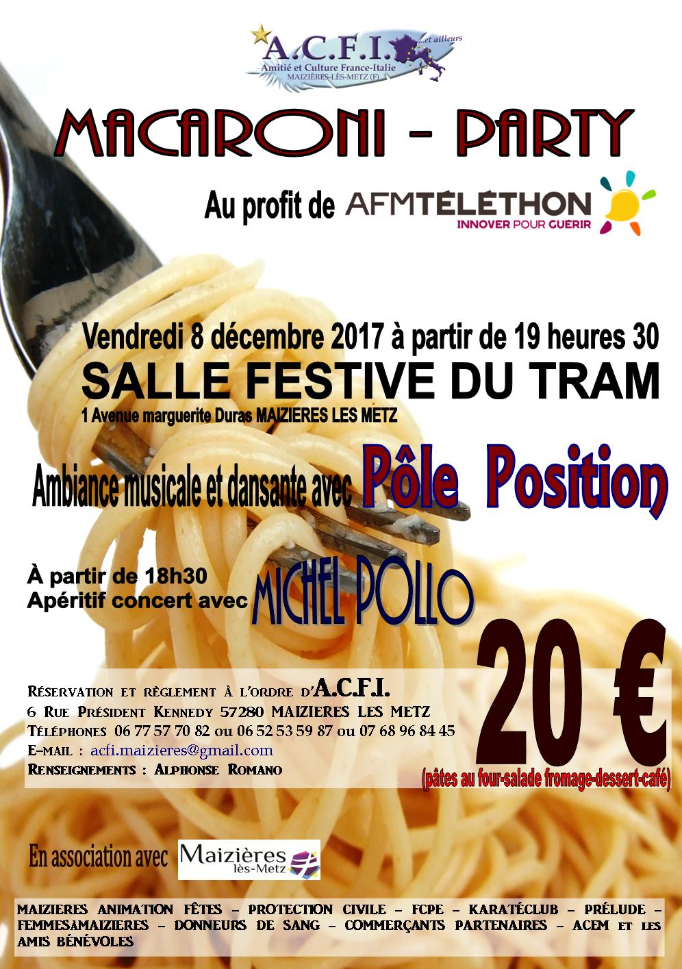 Participez à la 23ème édition de la MACARONI-PARTY organisée par ACFI en faveur du TELETHON.